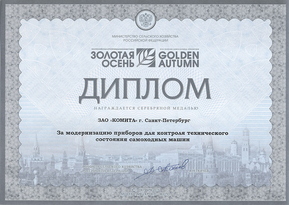 ЗАО «Комита» приняло участие в 17-й Российской агропромышленной выставке «Золотая осень», которая проводилась в Москве на территории МВЦ «Крокус Экспо» с 8 по 11 октября 2015 г. Во время выставки проводился конкурс «За освоение современных методов надзора за техническим состоянием самоходных машин и других видов техники», за участие в котором ЗАО «Комита» получило серебряную медаль и диплом в номинации «За модернизацию приборов для контроля технического состояния самоходных машин».