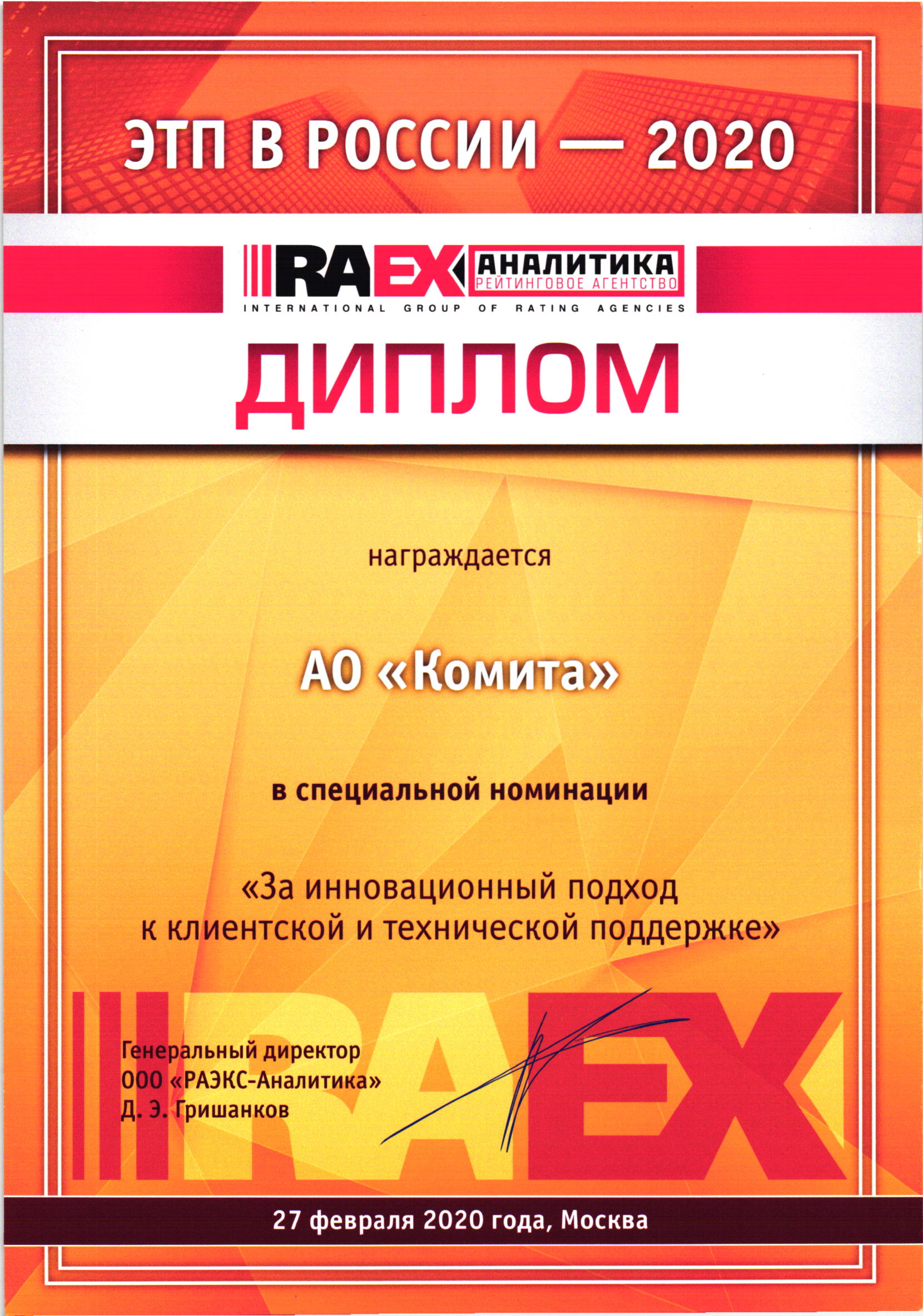 В феврале 2020 года Рейтинговое агентство RAEX (РАЭКС-Аналитика) наградило АО «Комита» дипломом «За инновационный подход к клиентской и технической поддержке». Эксперты RAEX в лице крупнейших заказчиков ЭТП высоко оценили Интерактивного робота «Виртуальный ассистент» как неотъемлемую часть Службы поддержки Оператора Электронной торговой площадки КОМИТА (etp.comita.ru) (до 26.04.23 - Универсальная электронная торговая площадка), Универсального электронного магазина (market.comita.ru), Электронного магазина ОАО «РЖД» (eshoprzd.ru).